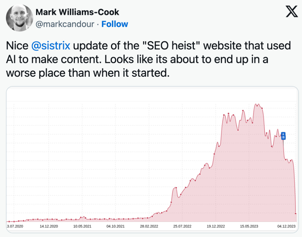 If startup marketers only use AI to create their SEO content, and fail to incorporate ‘The Human Element’ bad things happen, as we saw with the infamous “SEO Heist”.